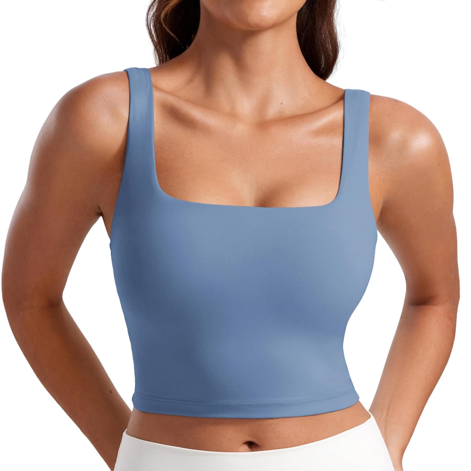 CRZ YOGA Butterluxe Womens Square Neck Longline Sports Bra – Workout Crop Tank Tops Padded Yoga Camisole with Built in Pads