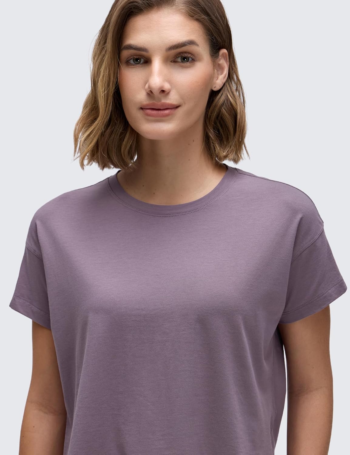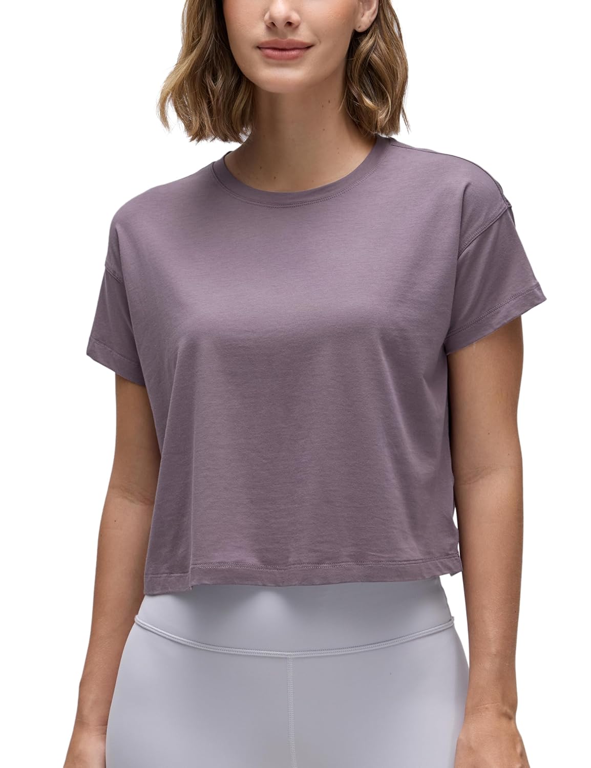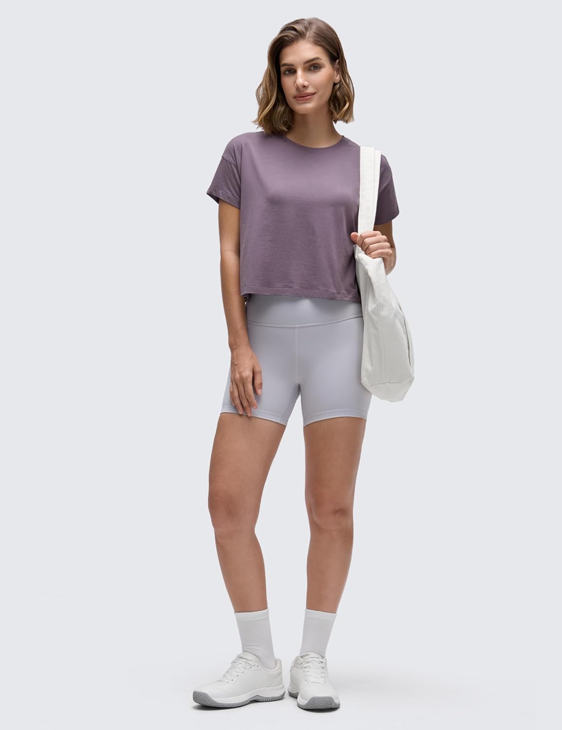 CRZ YOGA Women’s Pima Cotton Workout Short Sleeve Shirts Loose Athletic Crop Tops Gym Casual Cropped T-Shirt
