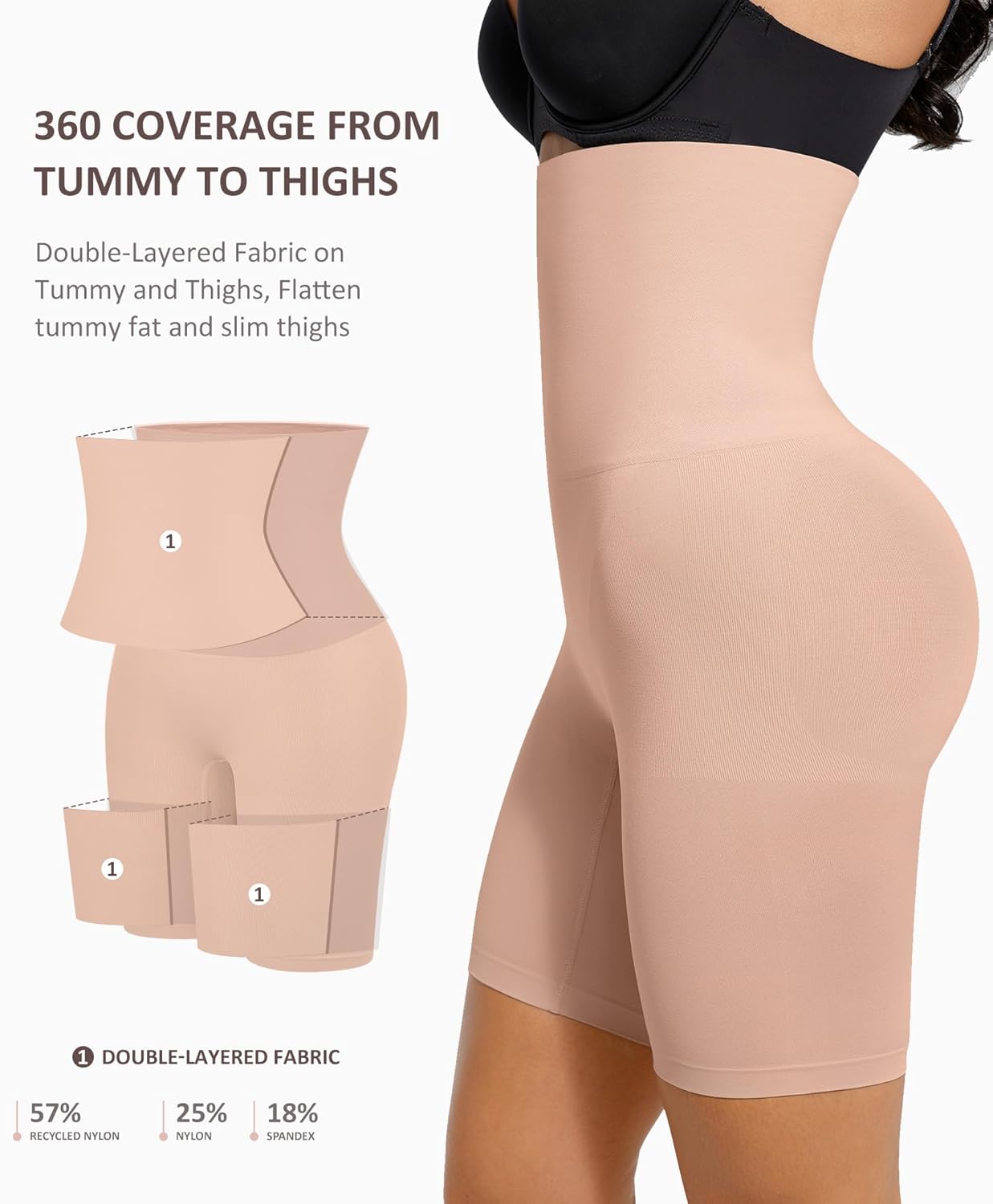 - RECYCLED MATERIAL: Our tummy control shapewear is made of recycled friendly materials, with 57% recycled nylon+25% nylon+18% spandex. Just like your second skin which is very comfortable and breathable. It fits great under all types of clothing, give you more charming hourglass figure all day long.