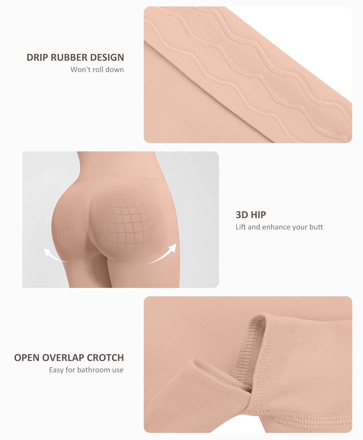 - BUTT LIFTER and THIGH SLIMMER: 3D buttock design can help tighten your bottom and lift up your butts, gives you the natural curves you want, make your booty look bigger and more pretty.Mid-thigh length for no chafing or thigh rub. It is designed to effortlessly tuck your tummy, slim your thighs and smooth your back. Crotch part has special overlap croth design which make it more comfortable and simple to go to bathroom without having to remove the whole control panties.