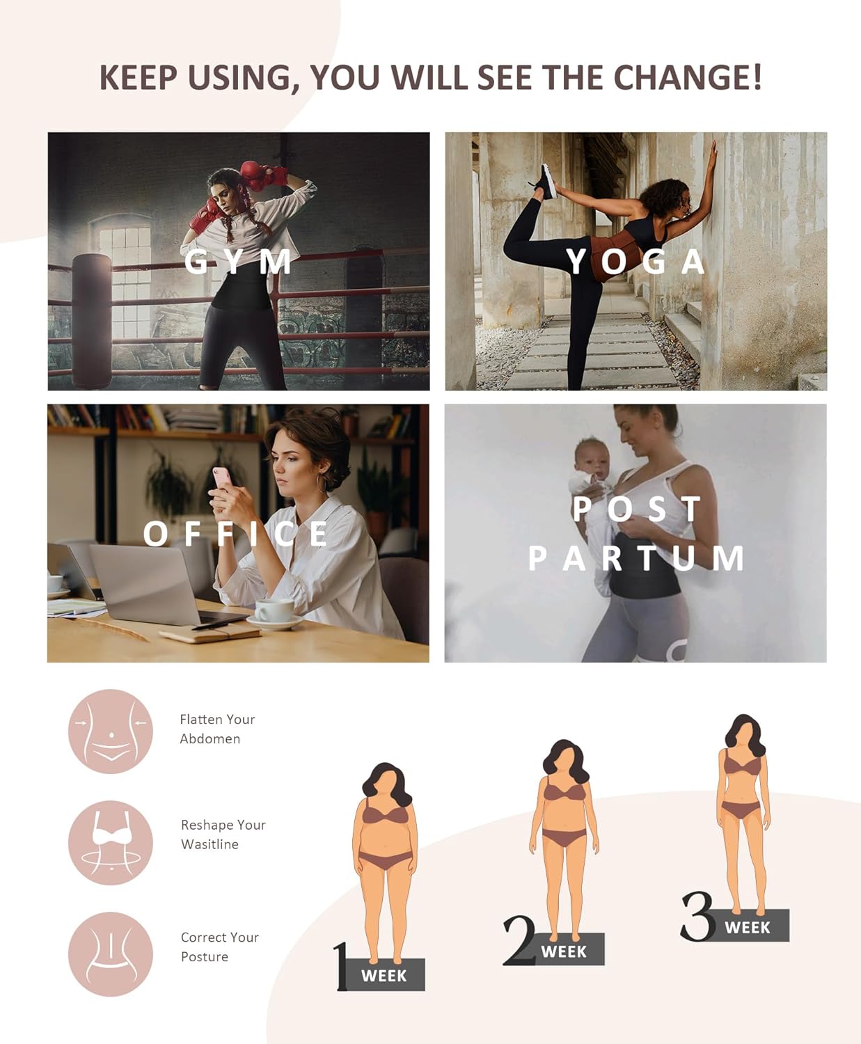 - Tips: Wear it consistently for 6 to 7 weeks, and you can expect to reduce your waistline by 6-8cm. Combine with exercise and a balanced diet for optimal results. Ideal for everyday wear, whether during work, running, workouts, postpartum recovery, or other fitness activities.