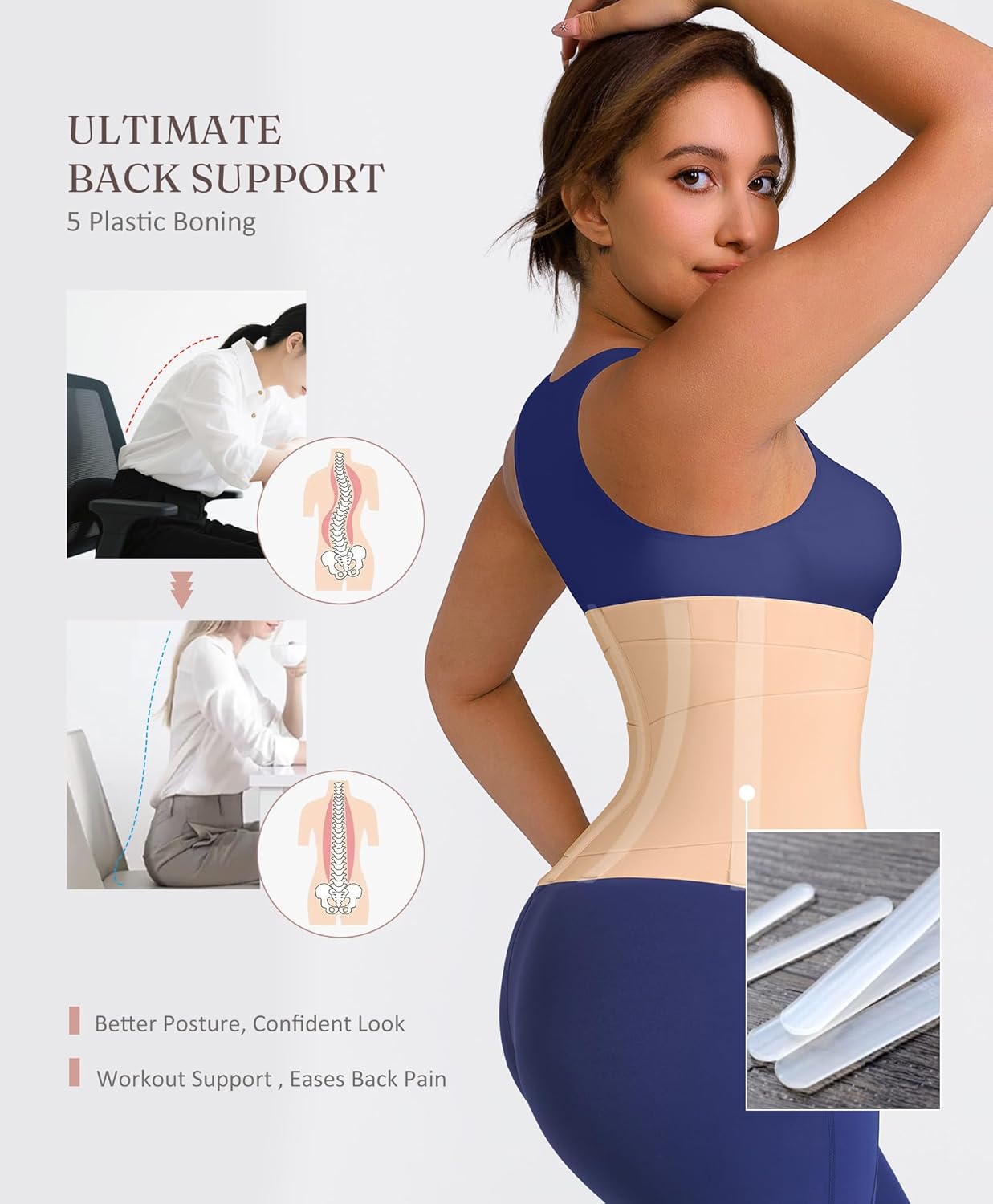 - SUPERIOR BACK SUPPORT AND POSTURE IMPROVEMENT: Center front length up to 30cm height,better than ever gribs your whole belly and back. Experience excellent back support with the built-in 5 plastic bones integrated into the waist trainer aids in straightening your posture, correcting your posture; womens waist trainer has 2 steel bones on the anterior piece to prevent abdominal rolling down, it allows you to move arbitrarily without any discomfort.