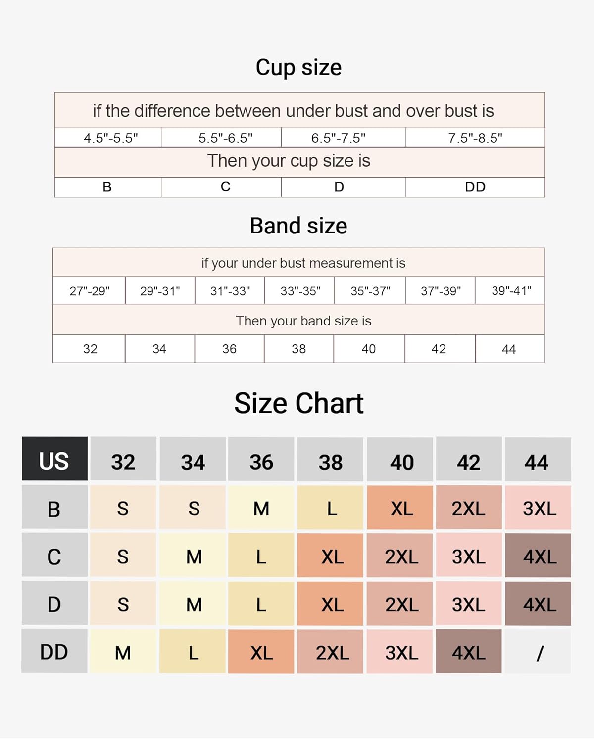 - Regular and Plus Size: Please read the size chart before ORDER: S(32B, 32C, 32D, 34B);M(32DD, 34C, 34D, 36B);L(34DD, 36C, 36D, 38B);XL(36DD, 38C, 38D, 40B);2XL(38DD, 40C, 40D, 42B);3XL(40DD, 42C, 42D, 44B );4XL(42DD, 44C, 44D). Our bra push up for women has regular and plus size to fit most women’s body type
