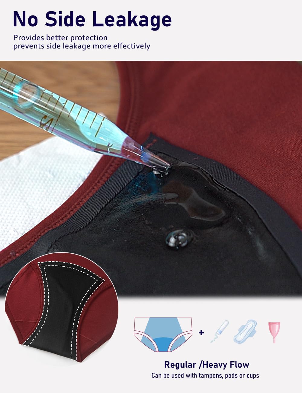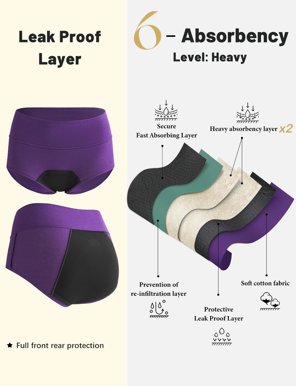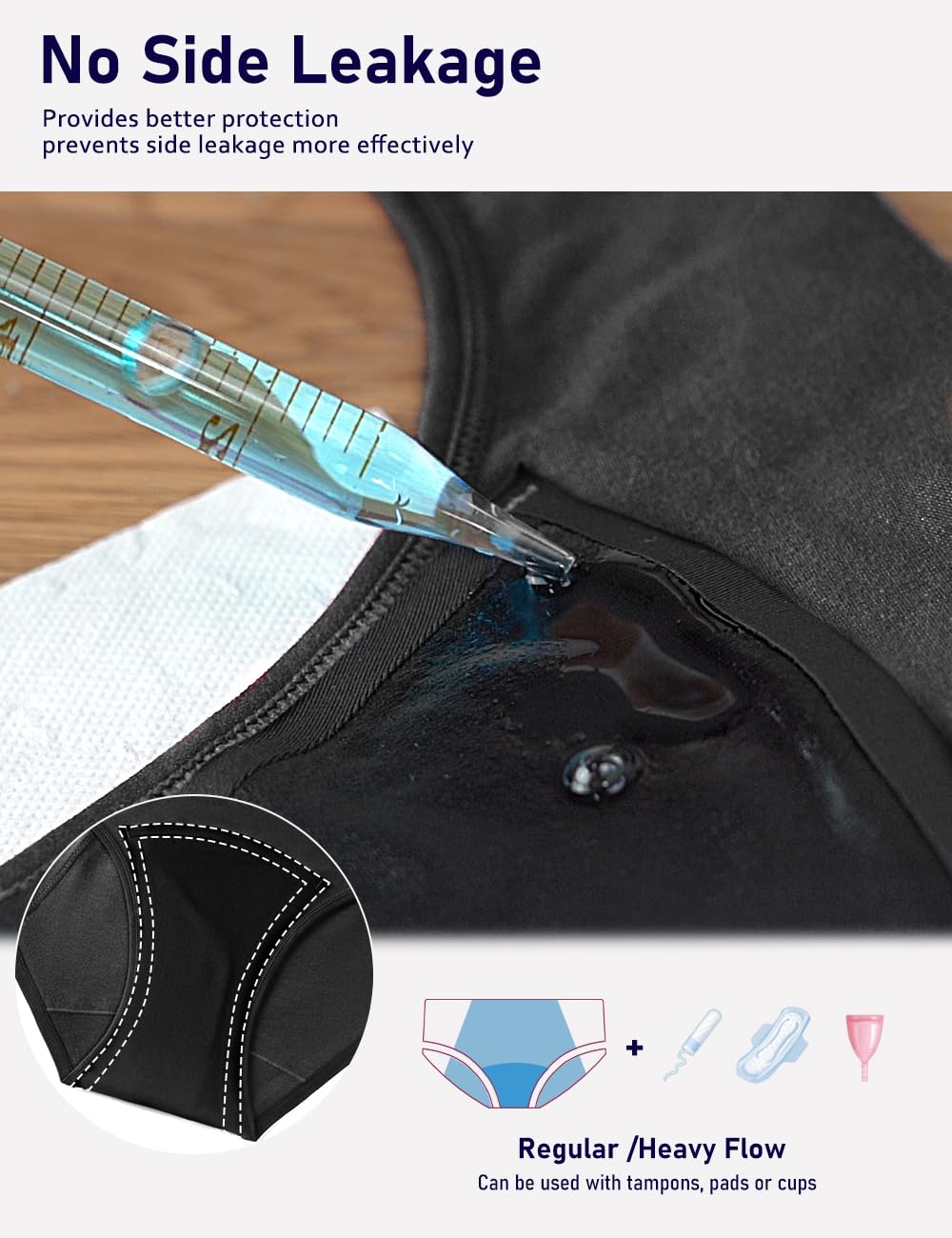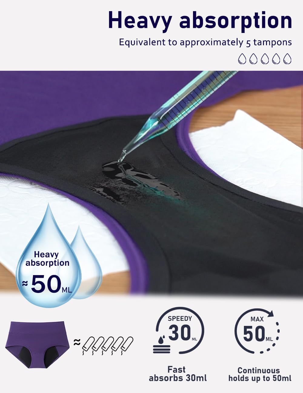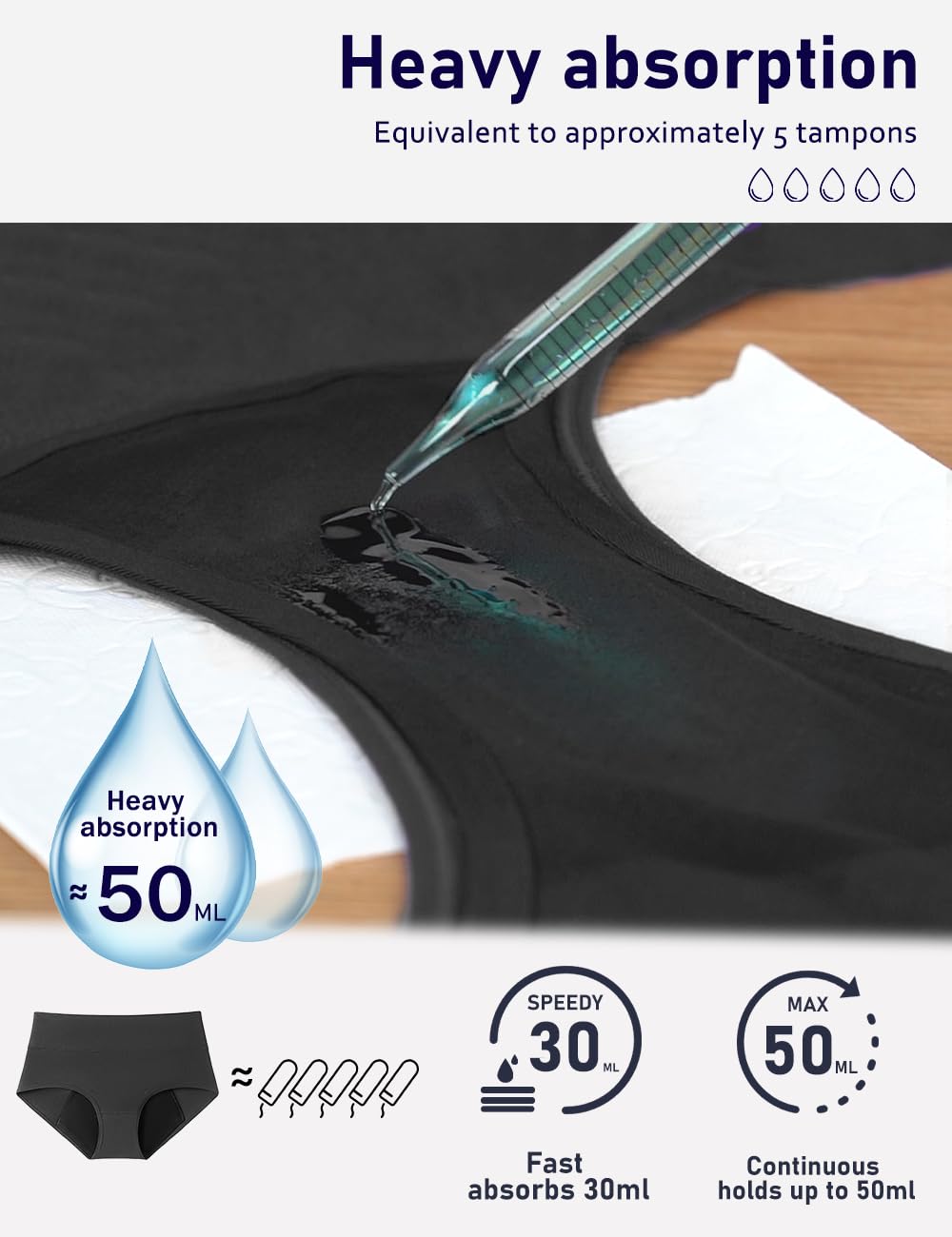 - Heavy Flow Period Underwear: Our Period Underwear features a double layer absorbent panel that quickly absorbs 30ml, continuous holds up to 50ml, can be used as the backup with pads, cups, and tampons during the heavy flow period night.