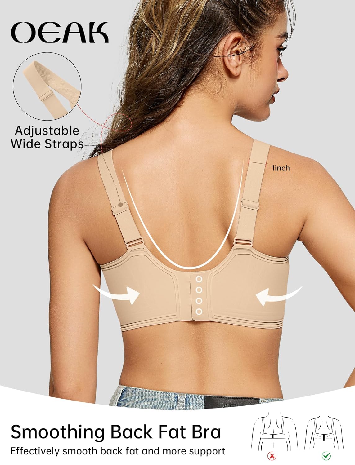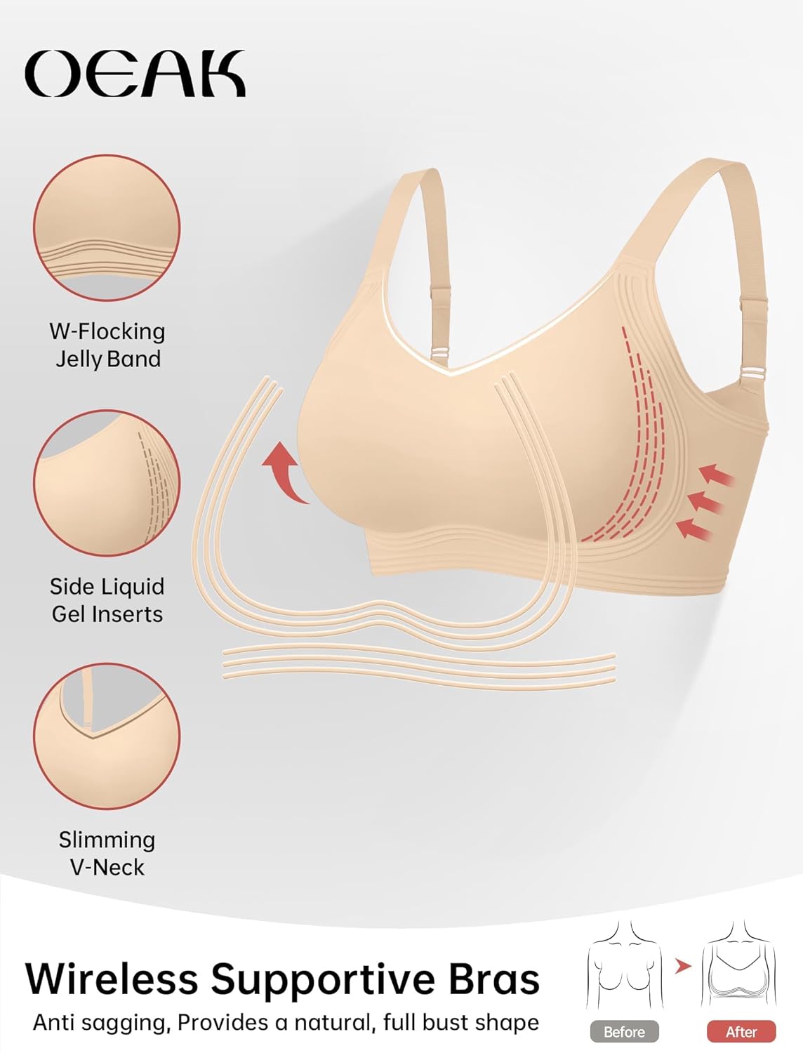 - 【Adjustable Straps】This anti-sagging bra with fully adjustable shoulder straps and 3in widened back buckle, allowing you to customize the fit to a comfortable position while ensuring the bra stays securely in place without any worry of slippage.The 4-row back hooks are designed to reduce the appearance of back fat and provide additional support, ensuring a smooth and flattering silhouette. The widened shoulder straps offer effective support and help alleviate any strain on your shoulders.