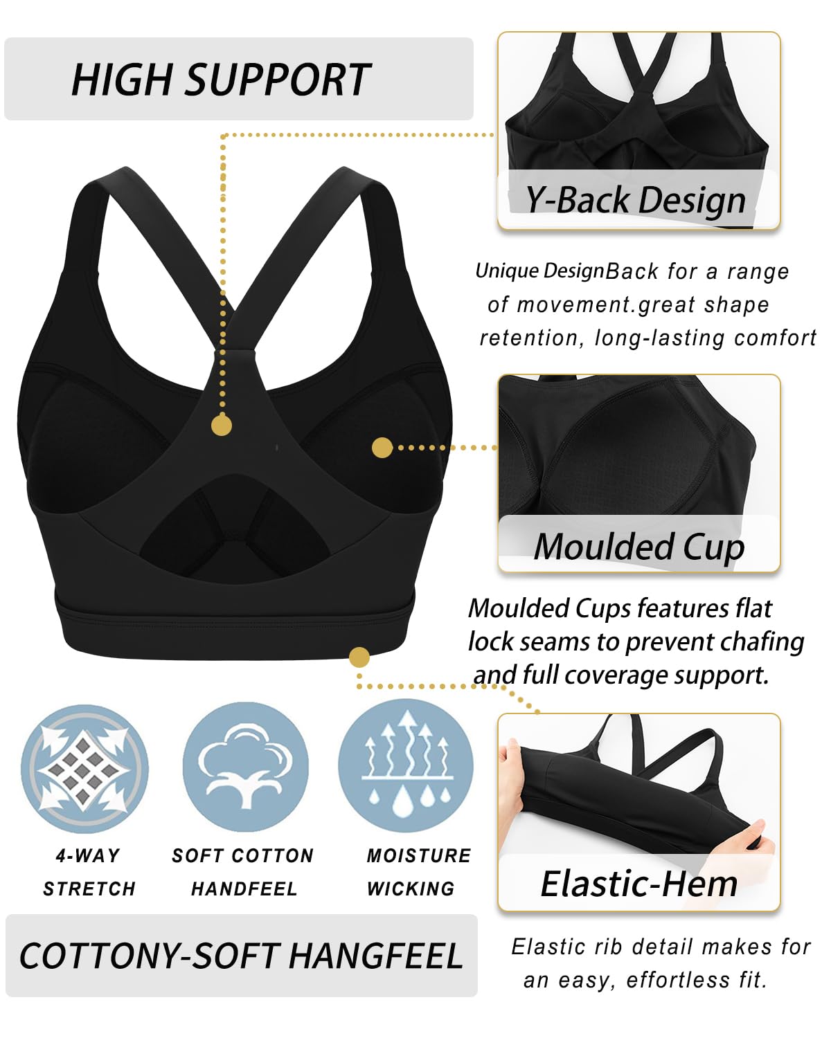 - WHY WE MADE THIS:Need a sports bra high support that does it all? Look no further!This sweat-wicking high impact molded cup sports bra gives you the full coverage and high support you need for yoga,run,and the gym-without restricting your movement or breath.fabric has added Lycra that allows the sports bras to stretch with you and retain its shape over time.Slip in optional,running girl moulded cup sports bras for full coverage—if you want it.