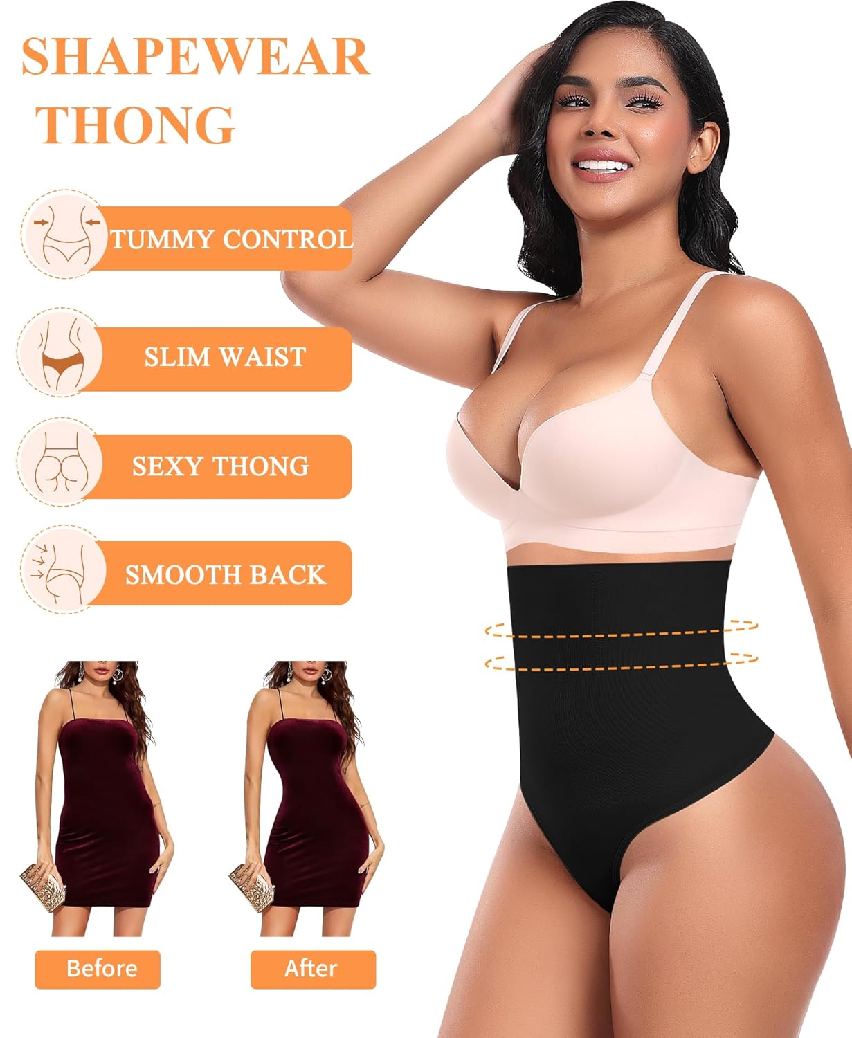 - High Waisted Thong Shapewear : The high rise design offers better shaping and control, wraps around your abdomen, giving a snug fit. Werena Thong shapewear tummy control provides light to medium belly control to help reshape your body and give you a slimmer and more charming body curve