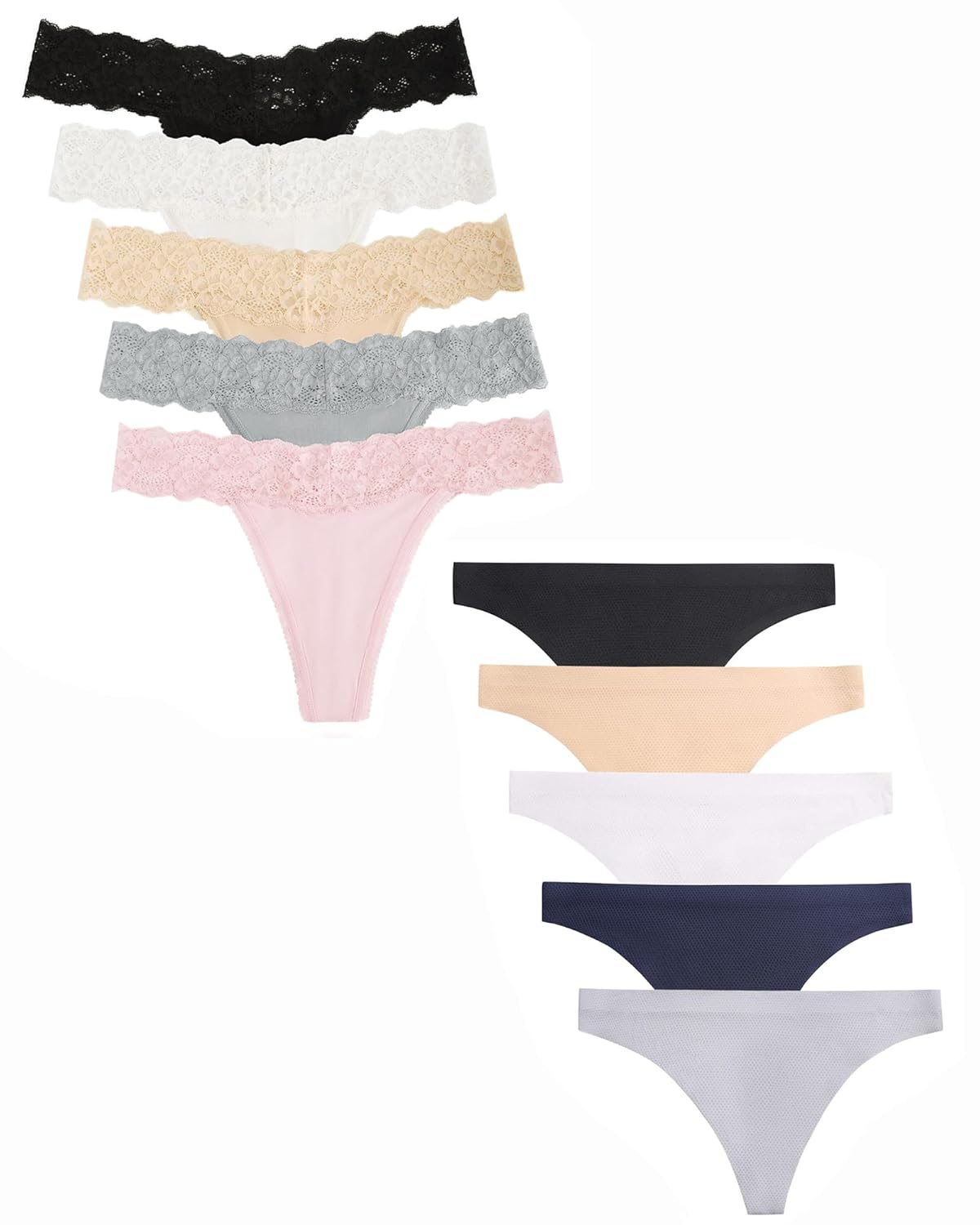 5Pack Seamless Thongs and 5Pack Seamless Lace Thongs No Show Ladies Thong,No Line Breathable Comfortable Panties Undies for Women